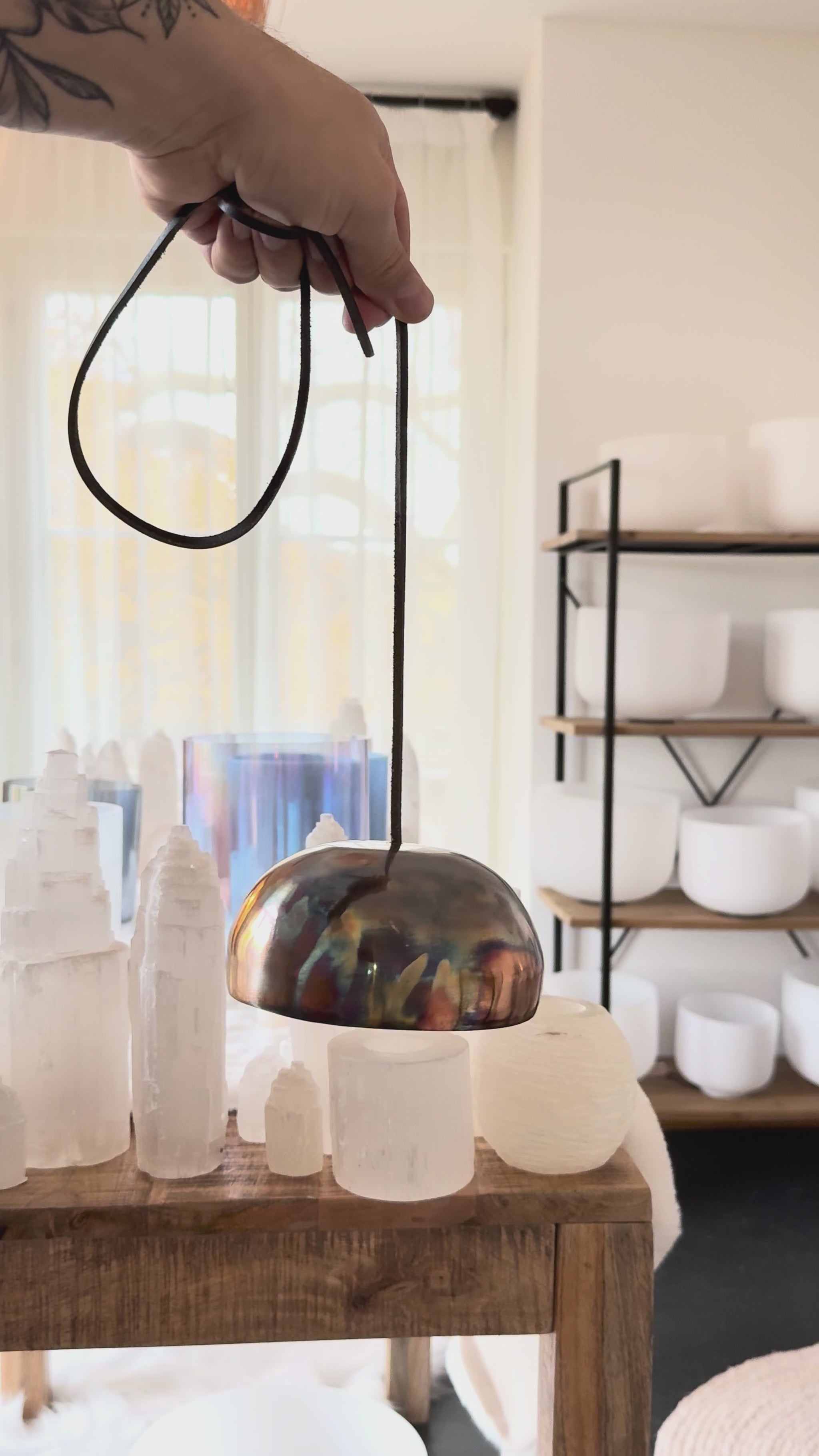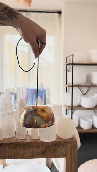 Plongez dans l’univers subtil des Bols Éclats d’Alchimie – Infinity Suspendue, des pièces uniques créées pour faire naître un son en mouvement, un véritable vortex vibratoire qui se déploie tout autour du corps et dans l’espace énergétique.